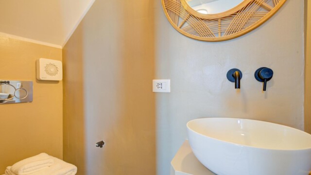 La camera è dotata di letto matrimoniale, bagno privato con doccia, TV a schermo piatto, aria condizionata e phon. Il design richiama la semplicità raffinata del viaggio, ma con un tocco distintivo che rende l’esperienza unica, anche solo per una notte.