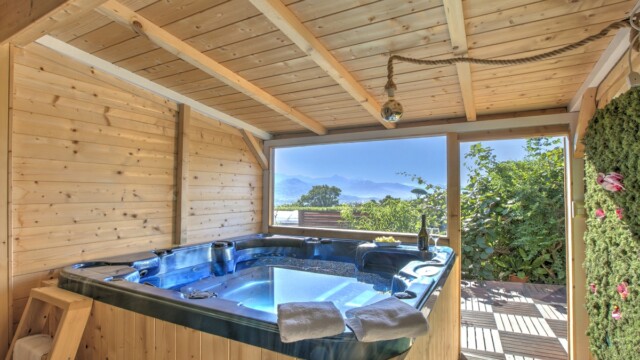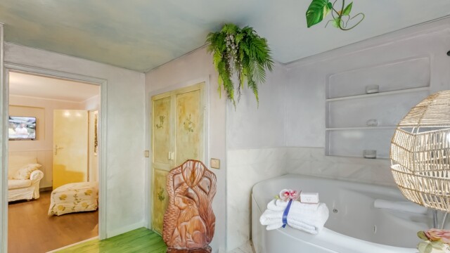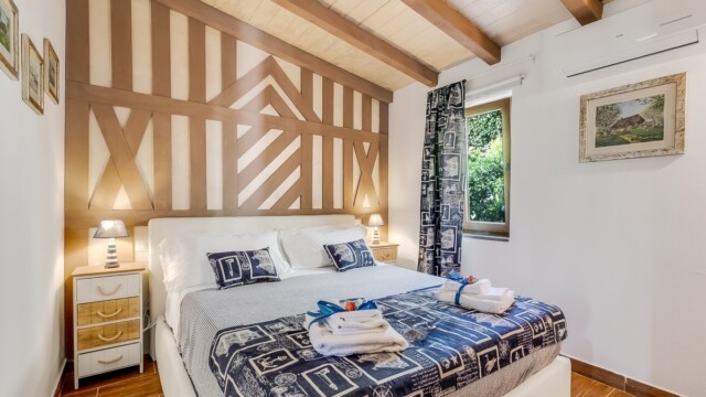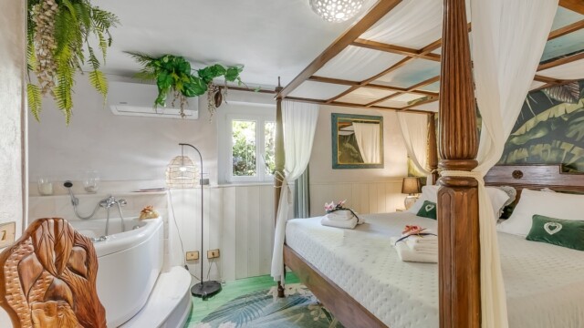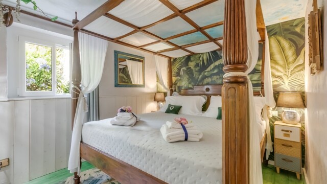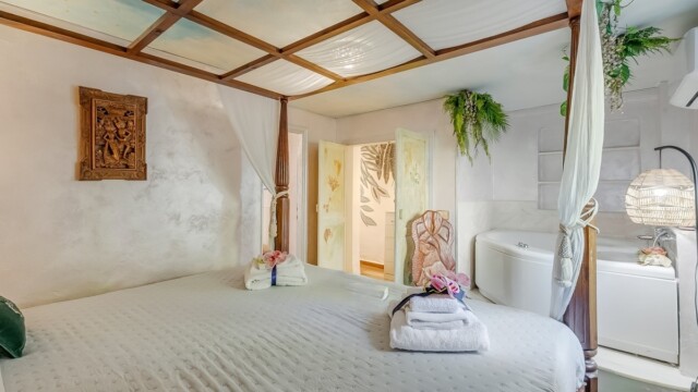 L’alloggio dispone di due camere matrimoniali, di cui una con un letto big size a baldacchino e una vasca idromassaggio per due persone direttamente in camera: un angolo esclusivo per momenti di puro benessere. L’altra camera matrimoniale offre ugualmente comfort e tranquillità.