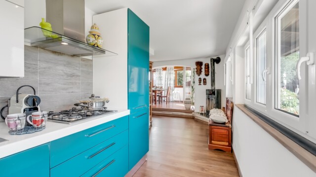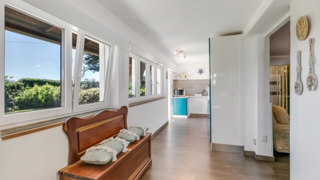 Completano l’appartamento un bagno con doccia, un accogliente salottino con zona TV, soggiorno e una cucina attrezzata con tutto il necessario. A rendere l’atmosfera ancora più calda e familiare, una stufa a legna e aria condizionata in entrambe le camere.