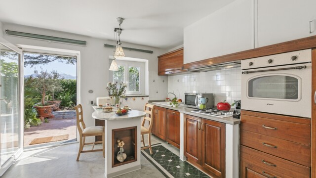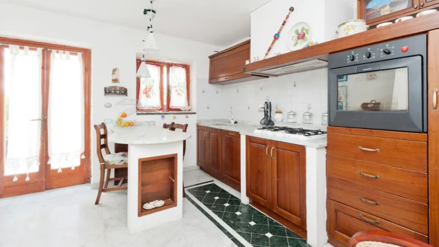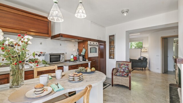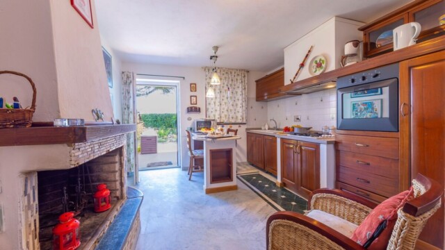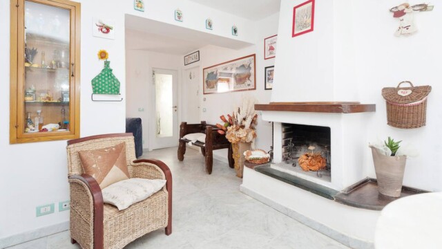 La zona giorno è composta da un ampio living con cucina attrezzata, tavolo da pranzo e camino, creando un ambiente caldo e accogliente anche nelle stagioni più fresche. È presente un secondo bagno con vasca e doccia, per il massimo della comodità.