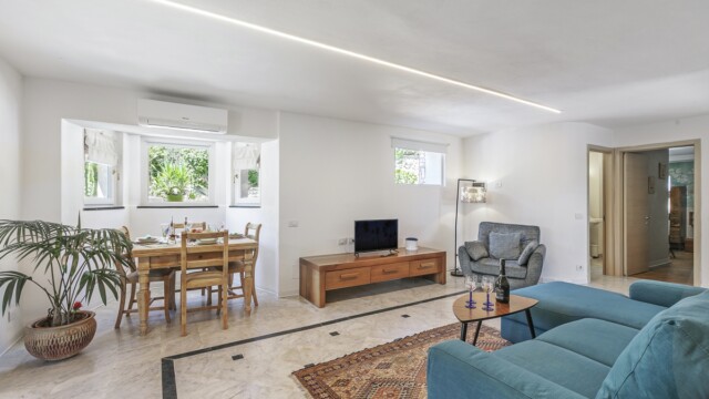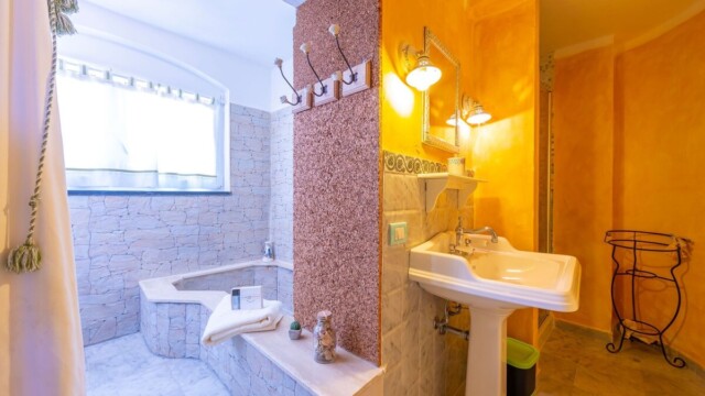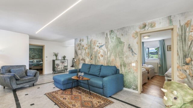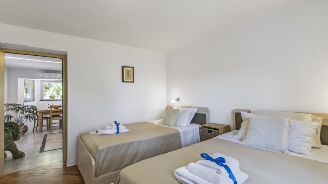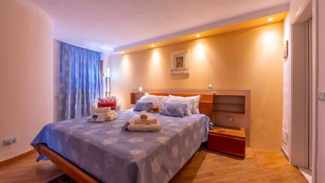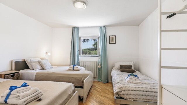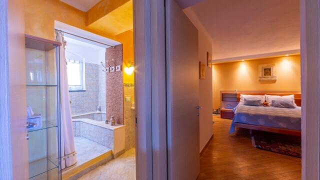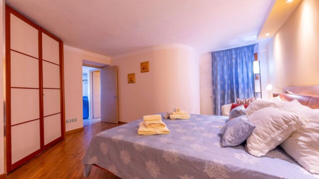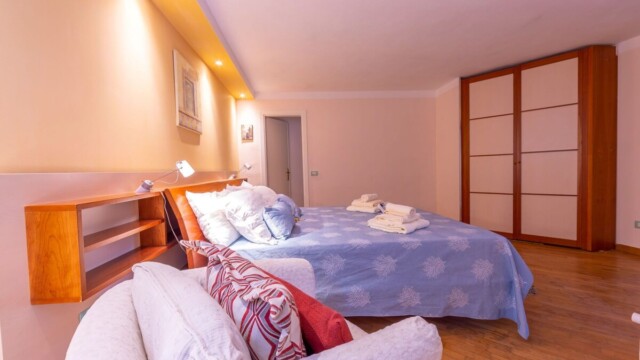 L’appartamento dispone di due camere da letto: una camera matrimoniale con bagno privato dotato di vasca idromassaggio, e una seconda camera più grande con due letti alla francese e un letto singolo, ideale per bambini o amici.
