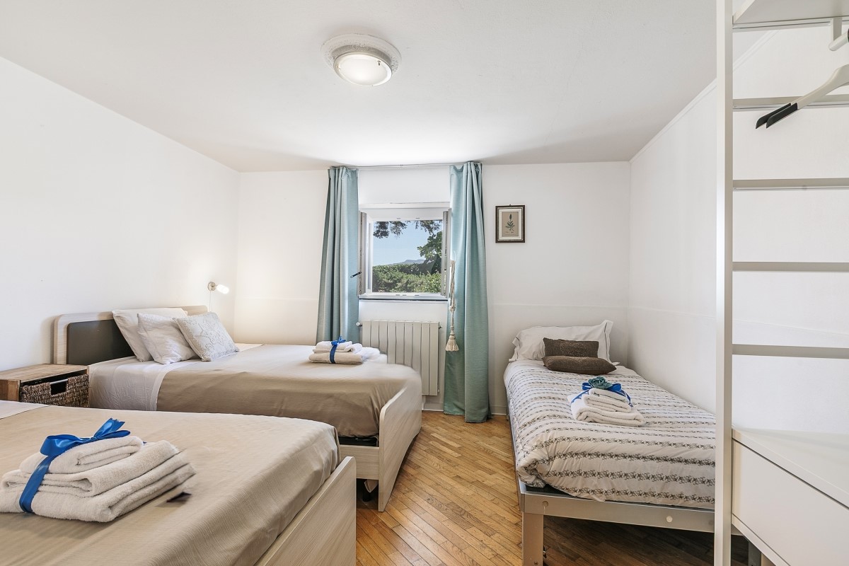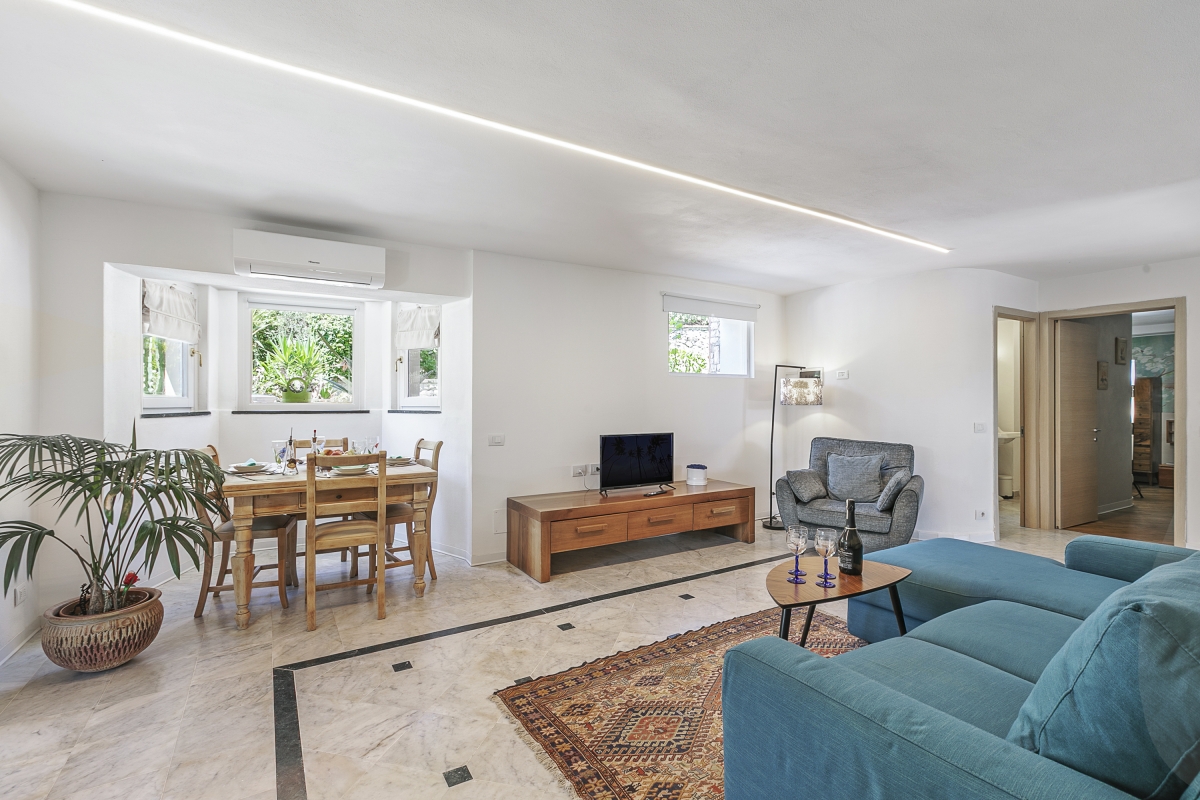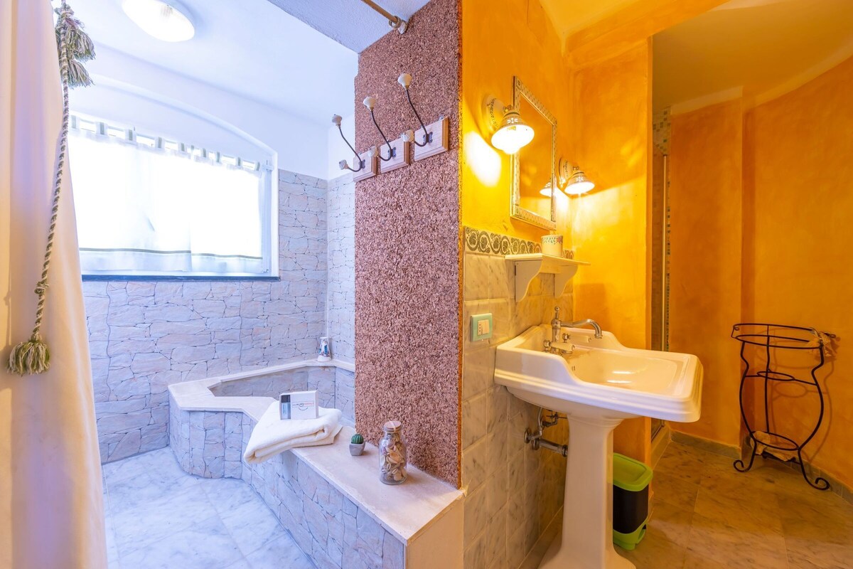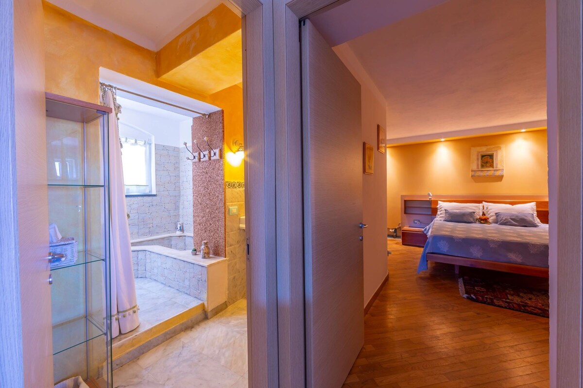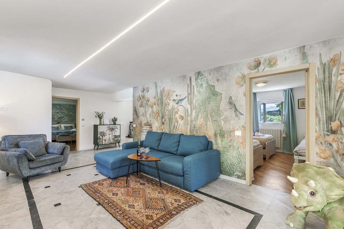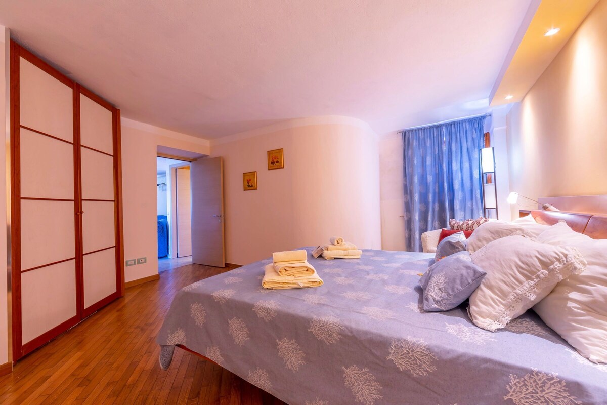 L’appartamento dispone di due camere da letto: una camera matrimoniale con bagno privato dotato di vasca idromassaggio, e una seconda camera più grande con due letti alla francese e un letto singolo, ideale per bambini o amici.